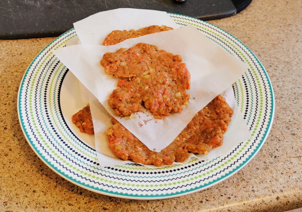 I grab a small chunk of mince, roll the meat into a round ball the size of a meatball – maybe a bit larger – and flatten the patty out between two pieces of parchment. I don’t use any special ‘as seen on tv’ tools, but feel free to get creative.