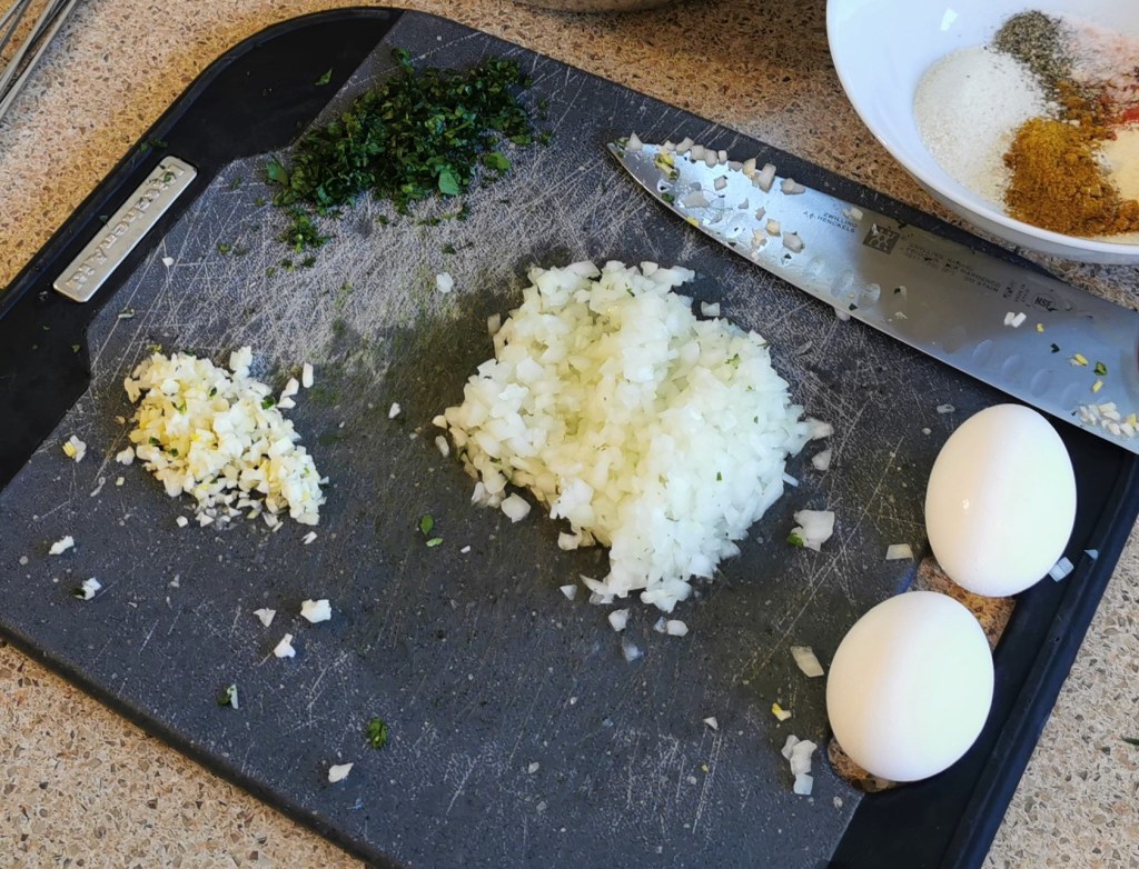 Once I have the ingredients prepared and set aside, and the parchment cut, I mix everything together (mince, spices, eggs) and begin forming the burgers.