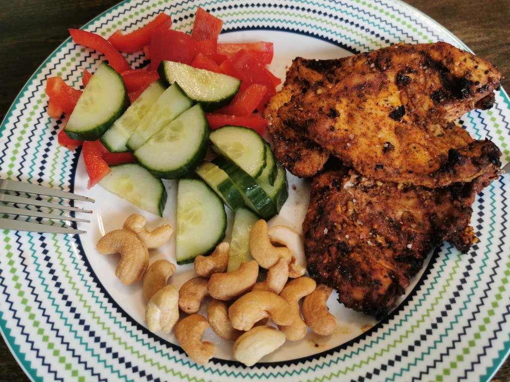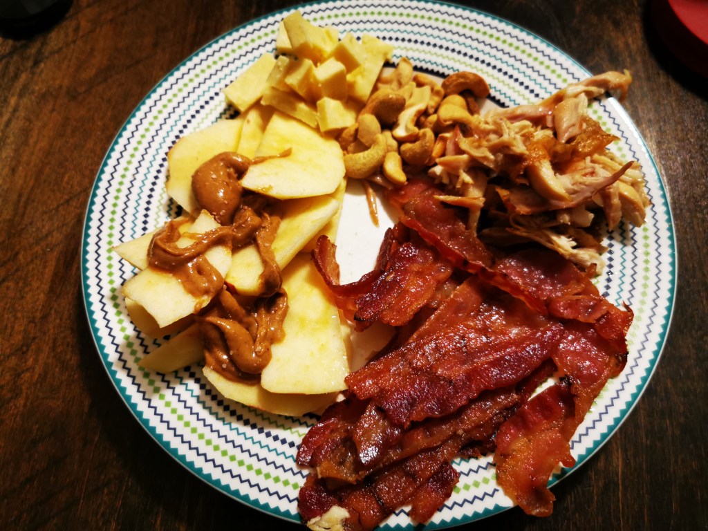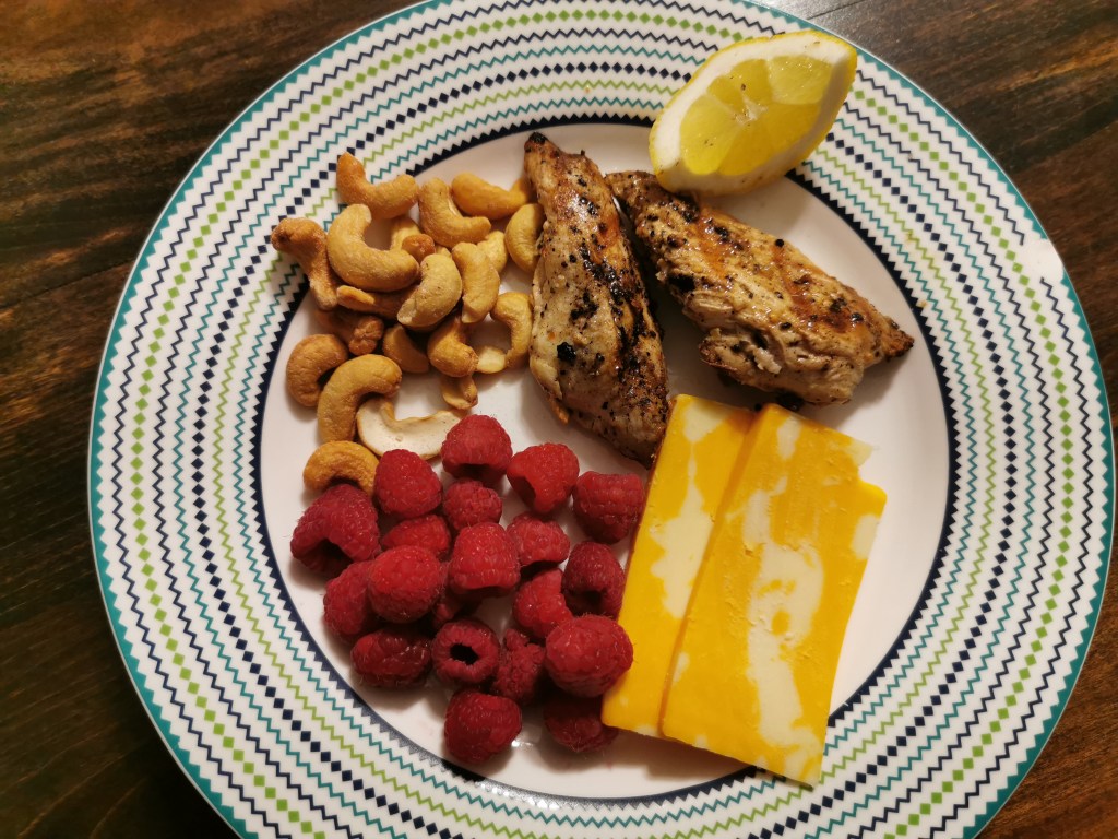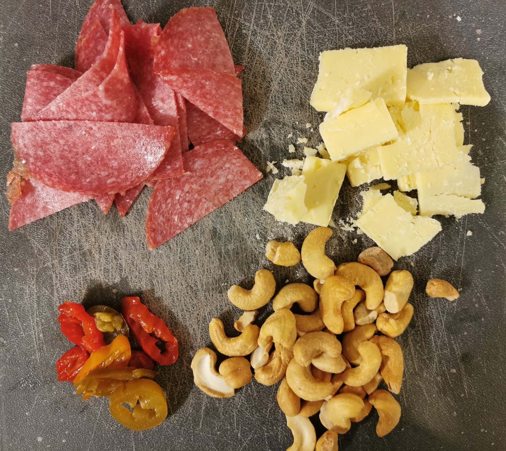 My charcuterie food board generally includes a mix of meat, nuts, cheese, fruit, and veg, but with an emphasis in favour of protein. Other than that, anything goes.